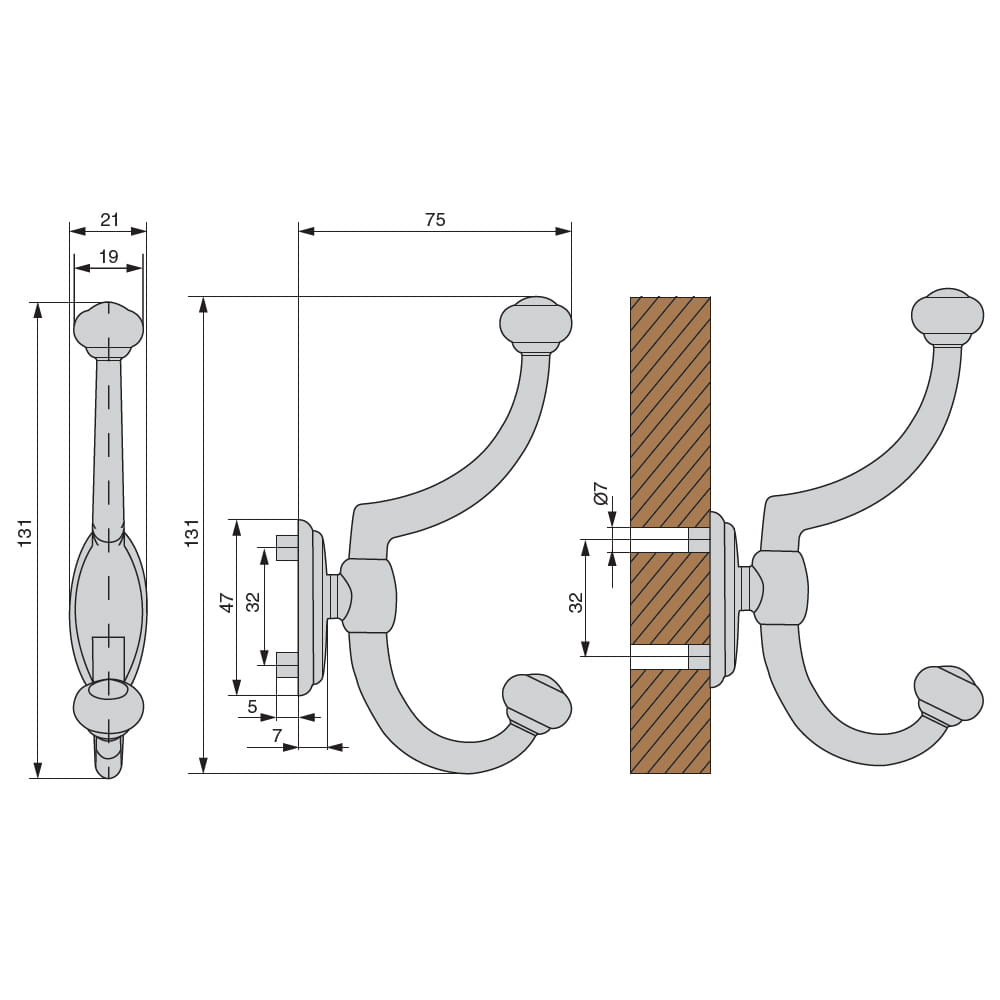 Klassischer Garderobenhaken ideal für den Flur oder das Badezimmer. Garderobenhaken zur Einbaumontage, von hinten montiert nach dem Prinzip der Möbelgriffmontage.
