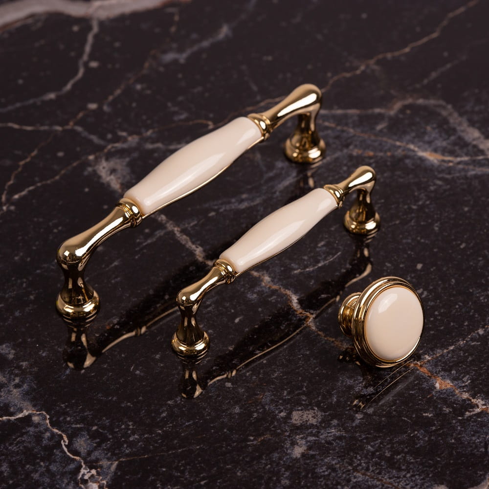 Stylischer und sehr eleganter, langer Porzellan-Möbelgriff aus der neuesten Kollektion Asti 07.GLG. Ideal für Möbel und Innenräume im Glamour-Stil. Cremefarbenes Porzellan kombiniert mit glänzendem Gold.