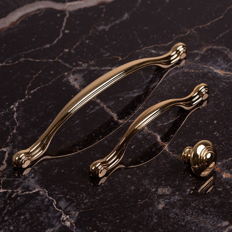 Sehr eleganter, dekorativer Möbelgriff in wunderschön glänzendem Gold. Ideal für Küchenmöbel, Badmöbel, Schränke und Kommoden.