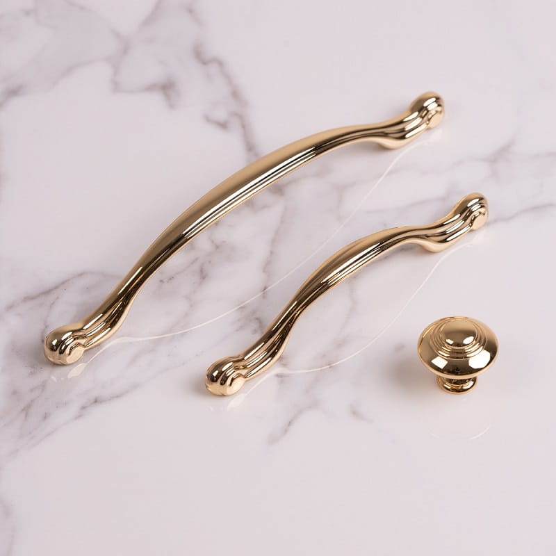 Sehr eleganter, dekorativer Möbelgriff in der Farbe von wunderschön glänzendem Gold. Ideal für Küchenmöbel, Badmöbel, Schränke und Kommoden.