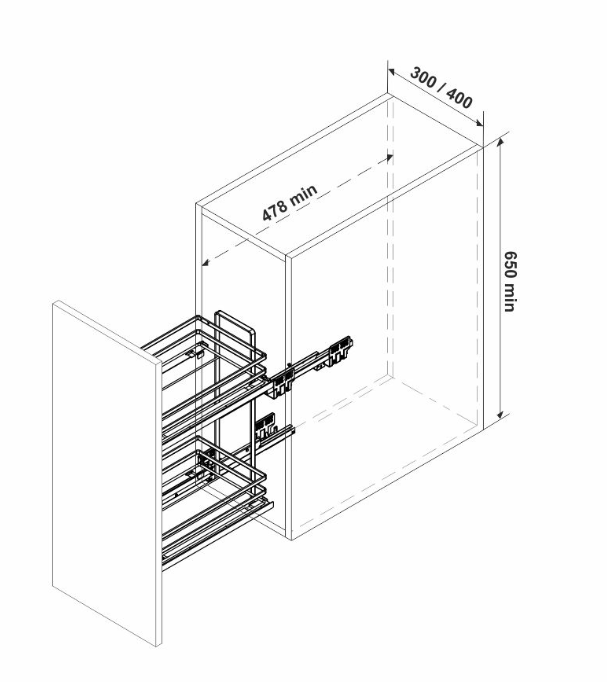 - Mocowanie: ukośne- jedna prowadnica montowana jest na górnej części, druga w dolnej części poziomu kosza, góra- obie prowadnice są zainstalowane w górnej części poziomu kosza, dół- obie prowadnice są zainstalowane na dole poziomu kosza