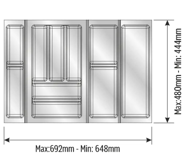 Zestaw pojemników na sztućce wykonany z przyjaznego dla środowiska polipropylenu, przeznaczony jest do modułów szuflad o szerokości 750mm i szuflad o głębokości 500mm. Zestaw ten pozwala wygodnie i schludnie ułożyć różnego rodzaju narzędzia w szufladzie.