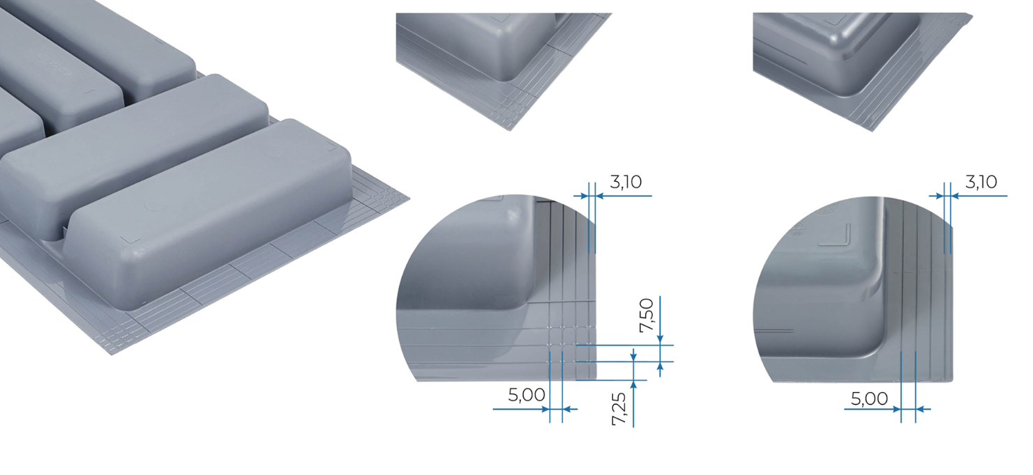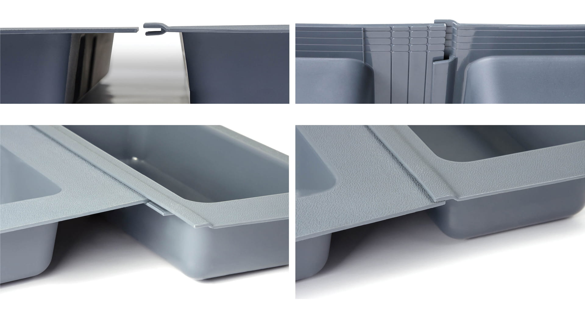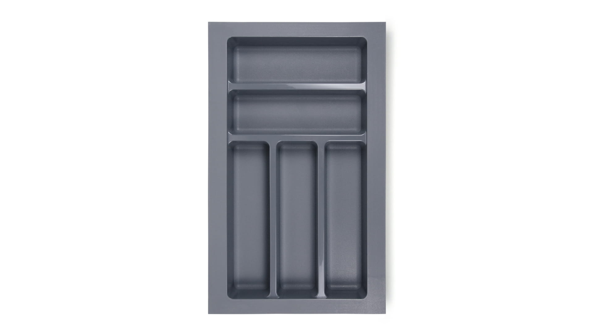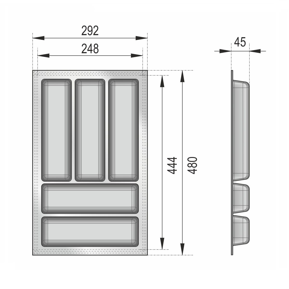 Wieloczęściowa taca wykonana z ekologicznego polipropylenu, niezbędna do przechowywania sztućców. Jest to obowiązkowy element formujący do formowania dowolnej kombinacji palet serii Casseti do szuflad meblowych o głębokości 500mm i szerokości 500mm. Po obu stronach korpusu znajdują się płaskie występy, które zapewniają dokładne i pewne wpięcie w rowki innych palet. Ergonomiczna konstrukcja 5- komorowej tacy pozwala na grupowanie przyborów kuchennych w różnych miejscach.