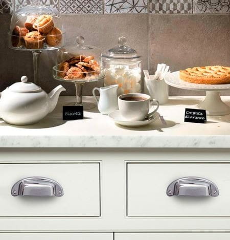 Moderner verchromter Küchengriff Anita in Muschelform. Bohrlochabstand 32 mm. Hergestellt in Italien.