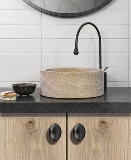Klassischer Griff in mattem Schwarz mit schwarzer Porzellanoberfläche und einem Montagebohrabstand von 96 mm. Maße: 110 mm x 19 mm. Hergestellt in Italien.