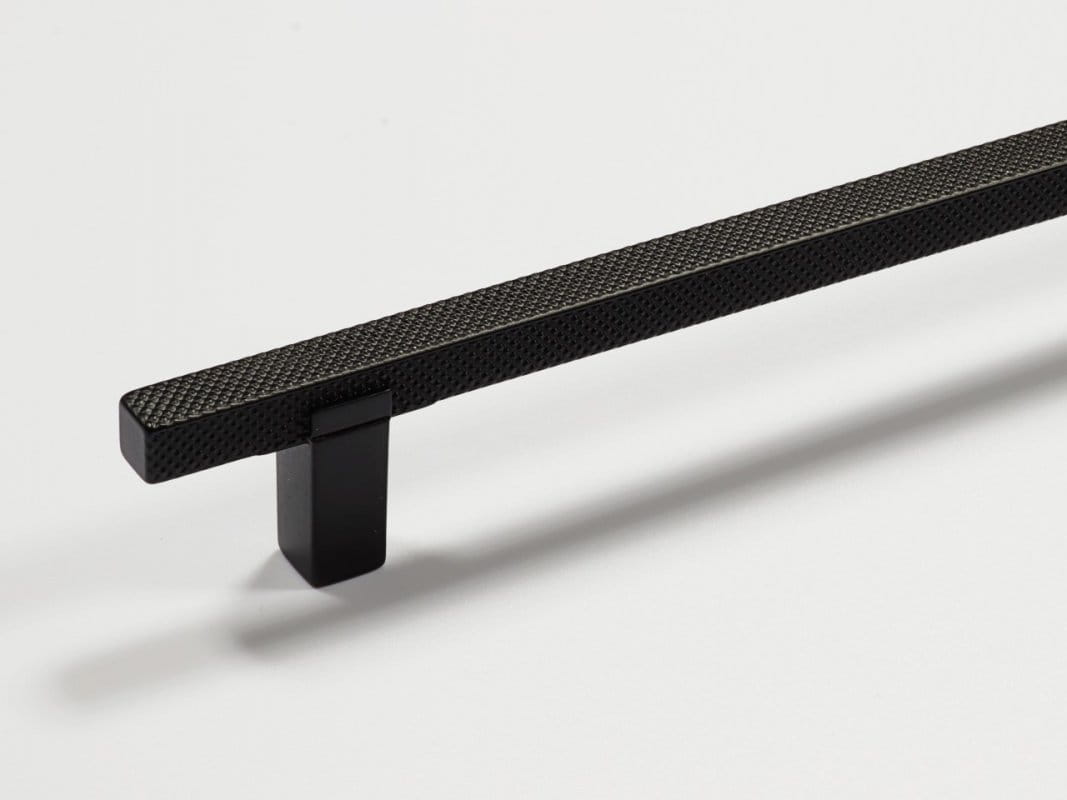 Möbelgriff Ponti N4 in mattschwarz mit einem Lochabstand von 320mm und geriffelter Struktur. Das stilvolle und zugleich minimalistische Griffmodell ist die ideale Lösung für Küchenmöbel, Wohnräume, Schlafzimmer, Badezimmer sowie begehbare Kleiderschränke.