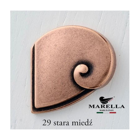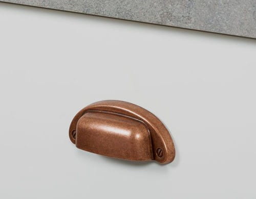 Klassischer wie auch moderner Griff Anita in Muschelform in Antik-Kupfer. Lochabstand 64 mm. Hergestellt in Italien.