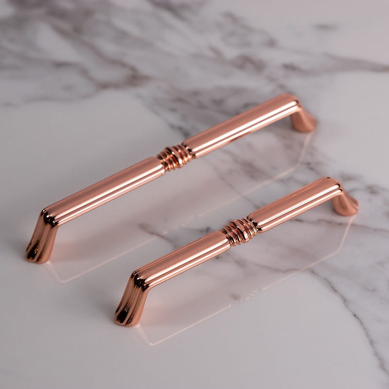 Moderner Stangengriff in glänzendem Roségold. Verfügbar in zwei Größen. Eignet sich hervorragend für klassische, elegante Möbel, Schränke und Schränkchen.
